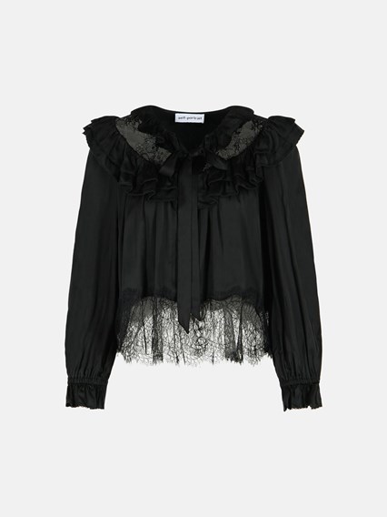 Knopfverschluss vorne und Spitze am Hals, dekorative Rüschen, getönte Spitzeneinsätze, elastische Bündchen