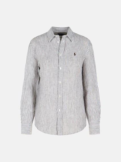 Spitzkragen, Knopfverschluss vorne, vertikales Streifenmuster, Logostickerei auf der Brust, Knopfmanschetten, ausgestellter Saum