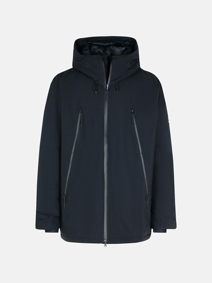 Daunenjacke aus schwarzem Polyester, große verstellbare Kapuze mit Kordelzug, gepolsterter erhöhter Kragen, Reißverschluss "Water Repellent", Brusttaschen mit Reißverschluss Water Repellent, kontrastierender Logodruck auf dem Ärmel, Bündchen mit Gamaschen, Velcro Verstellung am Handgelenk, Kordelzug am Saum