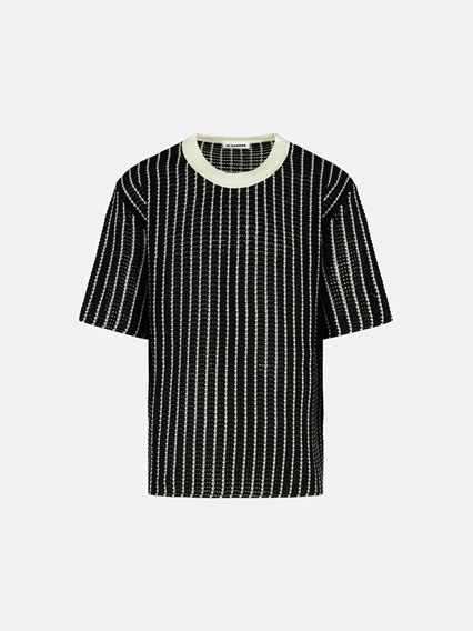 Crochet effect, contrast ribbed crew neck, contrast vertical stripe pattern, short sleeves, loose fit