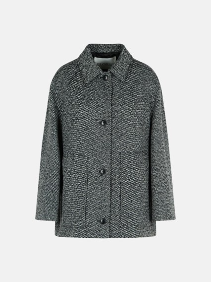 Pointed collar, button closure, front patch pockets, inner button pocket, embossed logo patch on the back, straight hem, lined garment