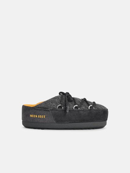 Grey 'EVX' 'Moon Boot x Guest In Residence' knit mules, ambidextrous design, collaboration logo, metal eyelets, crossed tubular laces, thermoplastic midsole, thermoplastic rubber tread, multisize foam lining, slip-on design