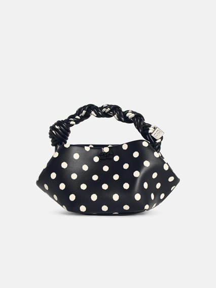 Contrasting 'Polka-Dot' pattern, tone-on-tone 'GANNI Butterfly' logo, 'GANNI' logo embossed on the back of the bag, knotted top handle, metal dice engraved with the 'GANNI' and ' logos Butterfly', adjustable and removable shoulder strap, snap button closure\n25 x 11.5 x 11 cm