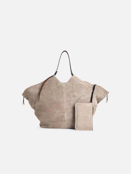 Metal hardware, curled top structure, adjustable leather shoulder straps, removable flat inner clutch bag with printed logo, drawstring closure, four white stitching on the front\n71 x 43 x 9 cm