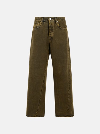 Belt loops, button closure, five-pocket style, back patch with embossed logo, wide leg