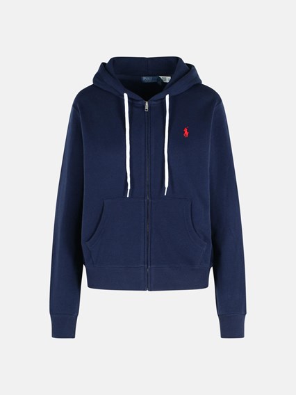 Drawstring hood, zip closure, front pouch pocket, contrast red logo embroidery on the chest, ribbed hem and cuffs