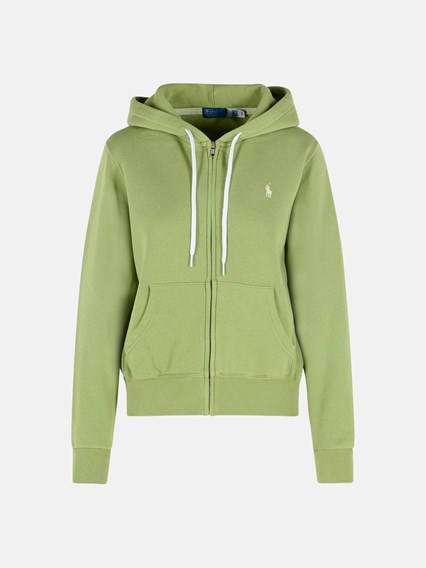 Drawstring hood, contrast logo embroidery on the chest, front zip closure, front pouch pocket, ribbed hem and cuffs, regular fit