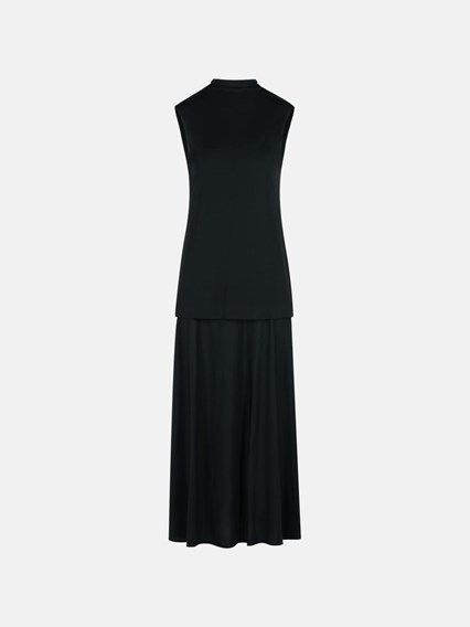 Raised neck with back lacing, back button closure, sleeveless, double layer top, long flowy skirt