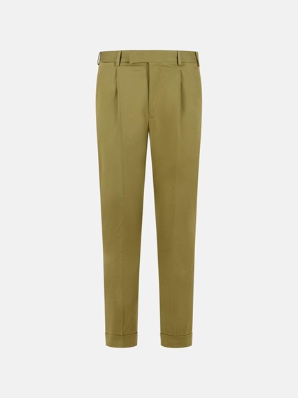 Belt loops, button and hook closure at the waist, hidden zip, side slit pockets, back welt pockets with flap and button, turn-up hem, front pin tucks