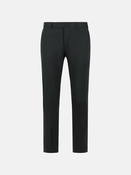 Belt loops, button and hook closure at the waist, hidden zip, side slit pockets, back welt pockets with flap and button, turn-up hem, front pin tucks