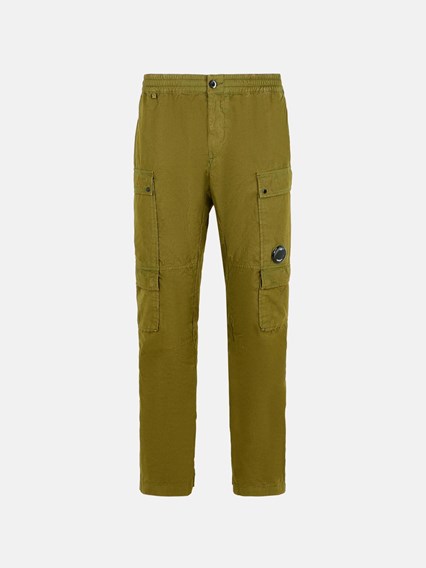 Vita elasticizzata, chiusura con bottone e zip, modello cargo mutitasche, applicazione 'Lens' sulla gamba, tasche posteriori a filetto, etichetta con logo sul retro