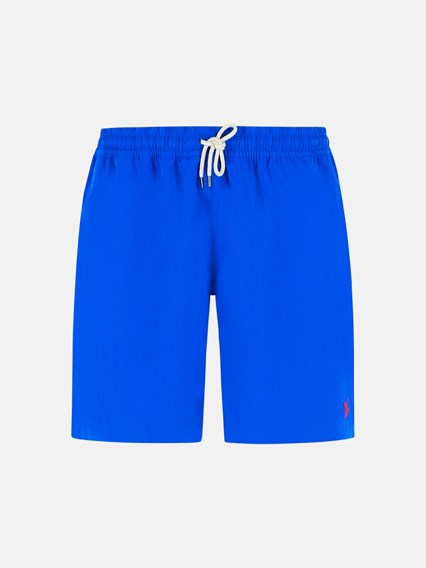 Vita elasticizzata con coulisse, tasche laterali a fessura, logo ricamato a contrasto rosso sul fondo, tasca posteriore applicata con patta e bottone, retina interna