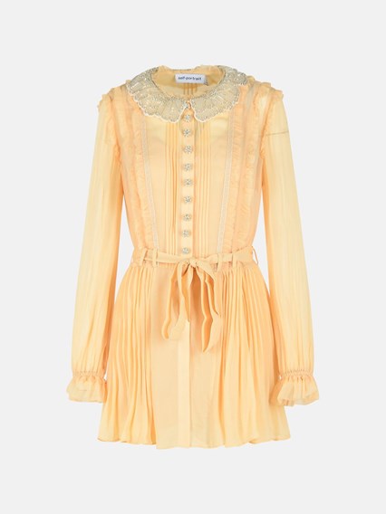 Realizzato in georgette di viscosa, colletto rotondo rivestito in paillettes e strass, abbottonatura frontale, vita con passanti e cintura removibile, fondo manica elastico, gonna plissettata