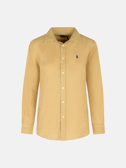 Colletto a punta, chiusura a bottoni, logo ricamato sul petto a contrasto blu, polsini con bottoni, piega centrale posteriore