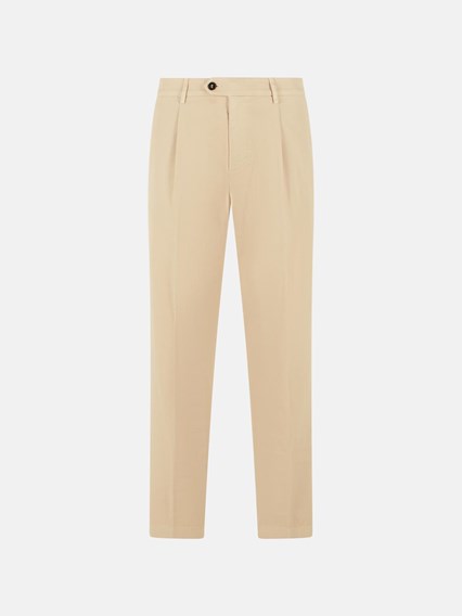 Vita con passanti, chiusura con gancio e bottoni in vita, zip nascosta, pieghe frontali, tashe laterali a filetto, tasche posteriori con bottone